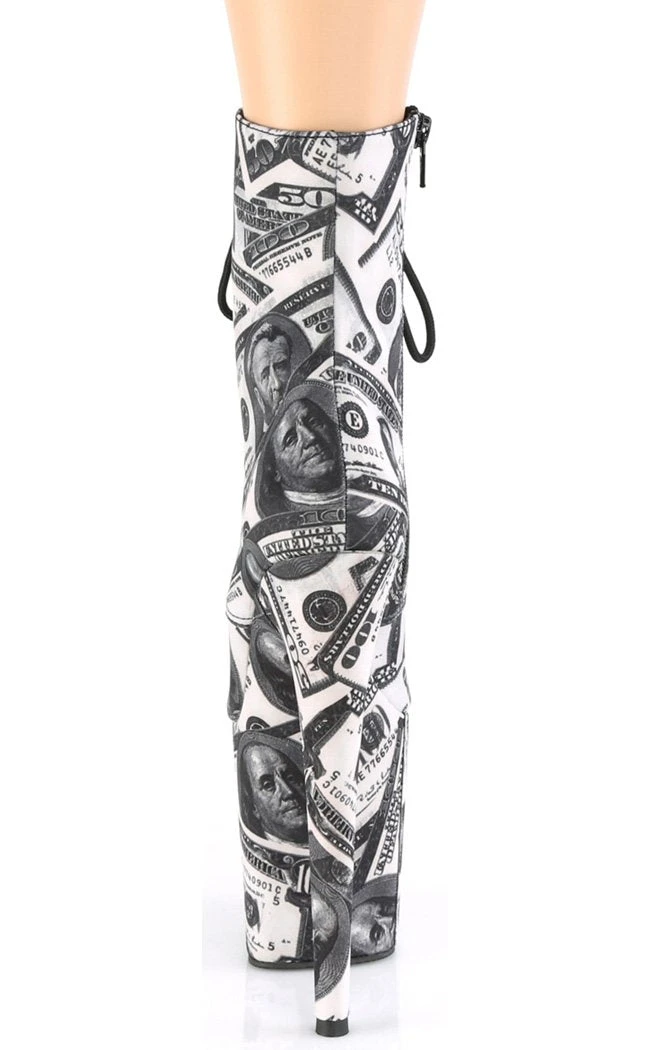 8″ (200mm) Heel, 4″ (100mm) platform boots covered in a print of US bank notes. Side zip closure.