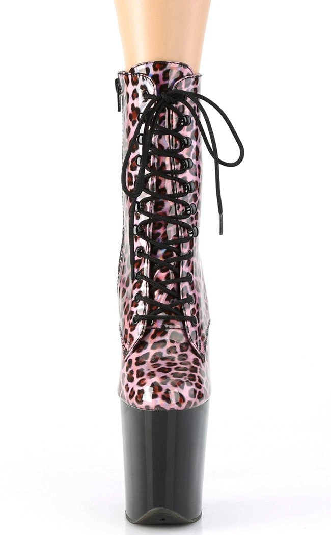 These Flamingos have a crazy holographic leopard print upper in shining baby pink. The platform and heel is a sleek black patent and secures with a lace up front and inner zip closure.