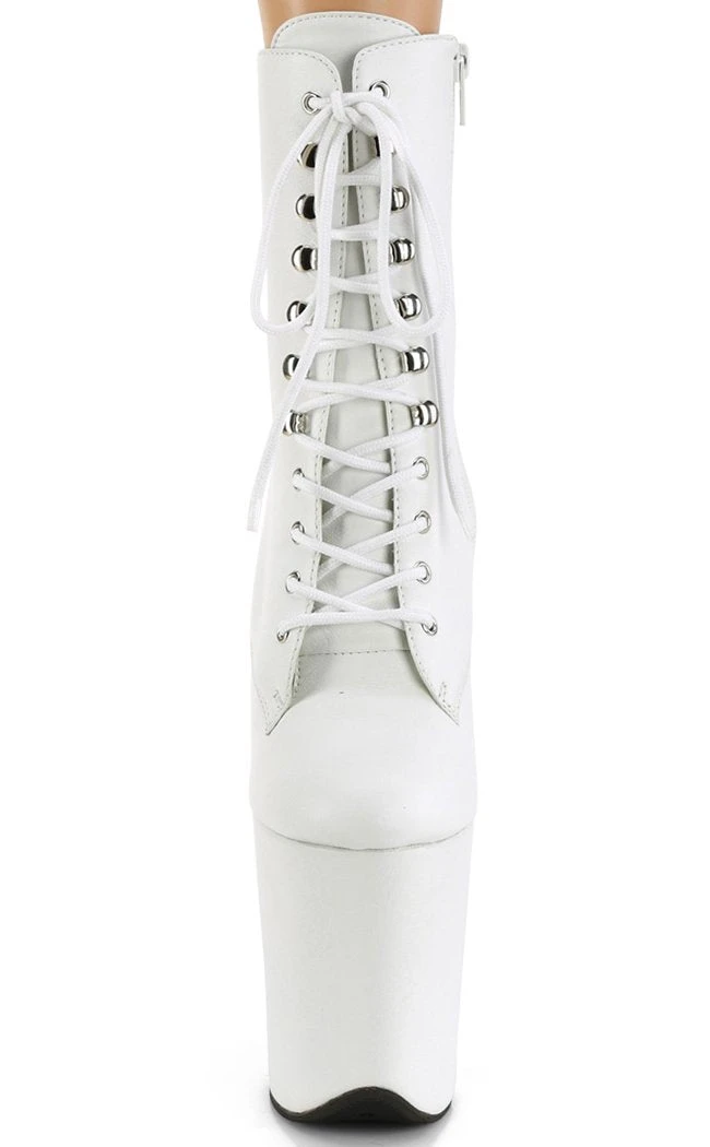 These boots feature a matte, genuine leather white upper. The platform and heel is a matching white, the boots fastening with a lace up and inner zip closure.