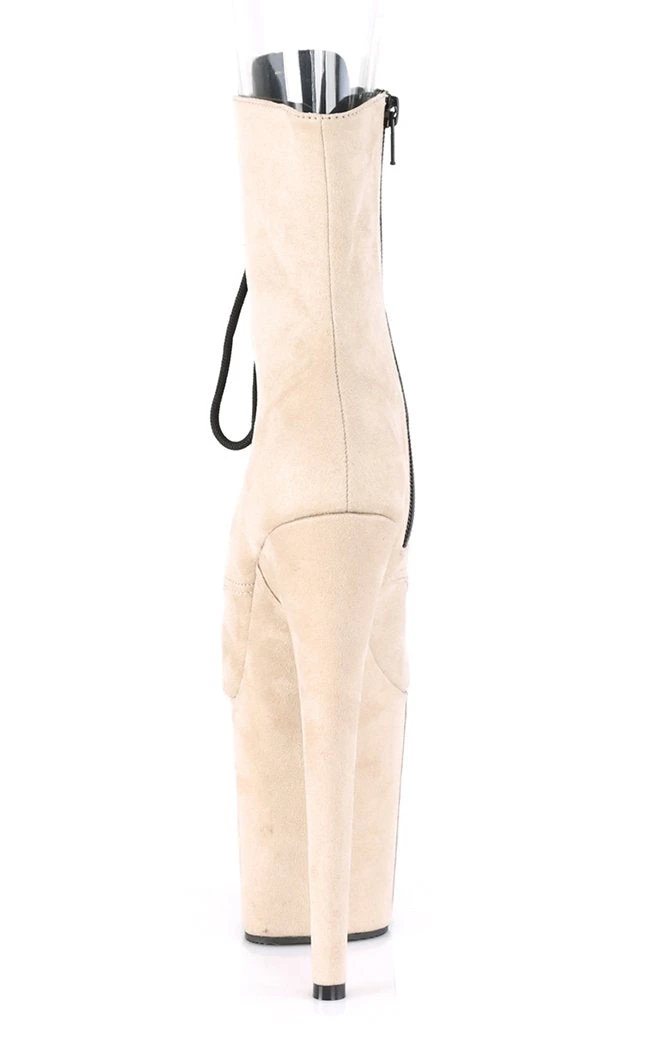 Stand tall, babe! You’ll be towering over the crowd in the Flamingo series. These pole-dancing booties feature all over neutral beige faux suede with peep toe front and contrasting black laced up front.