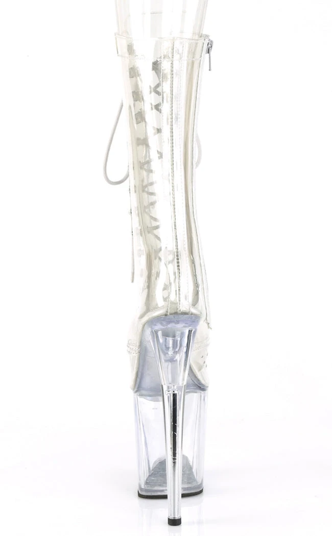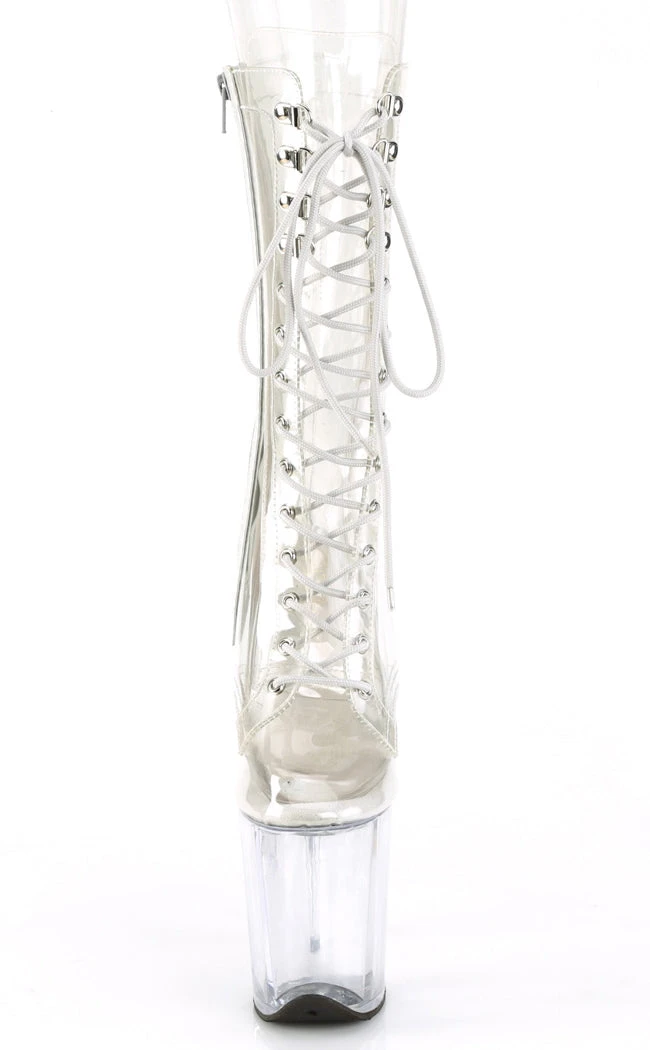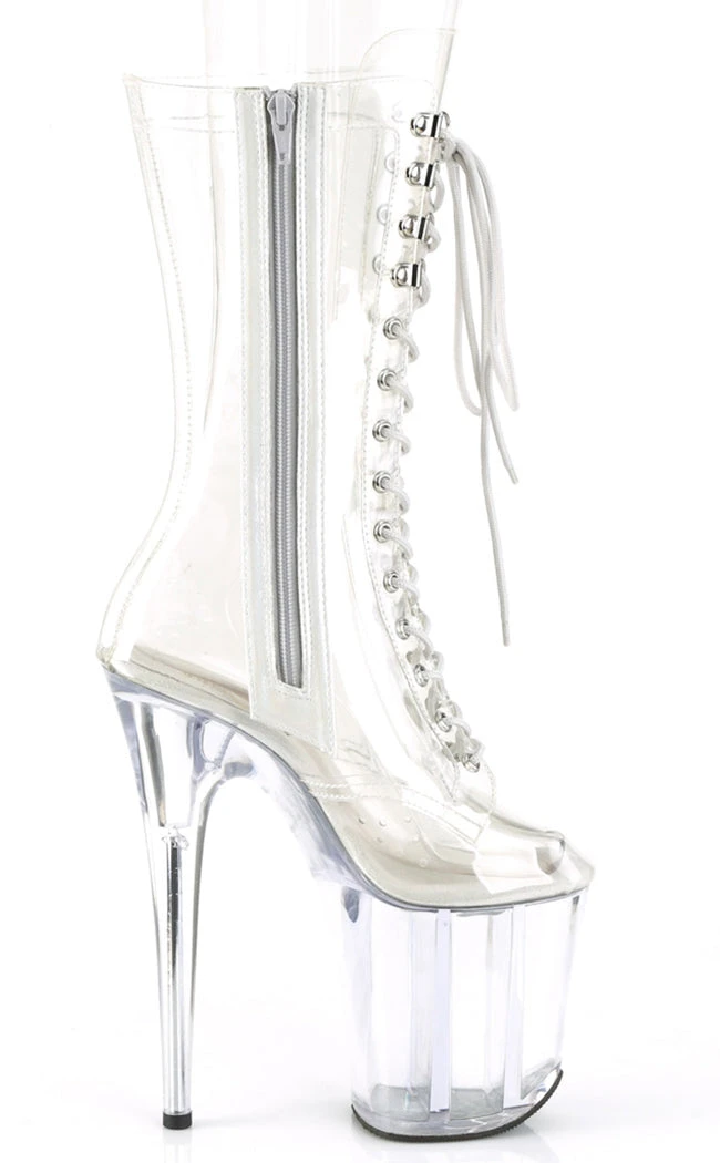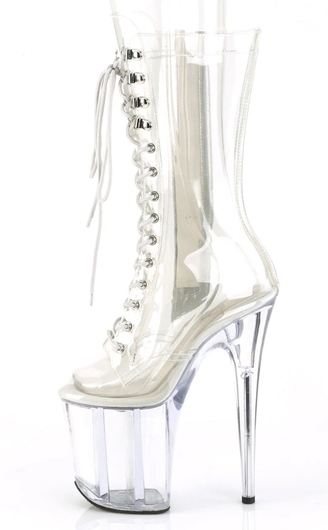 Leave nothing to the imagination in the FLAMINGO-1050C boots! These mid-calf boots feature a clear upper and platform, securing with a lace-up panel and inner zip.