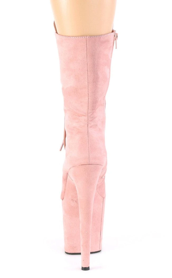 8″” (200mm) heel, 4″” (100mm) platform lace-up front mid calf boot featuring fully wrapped platform bottom, inside zip closure
