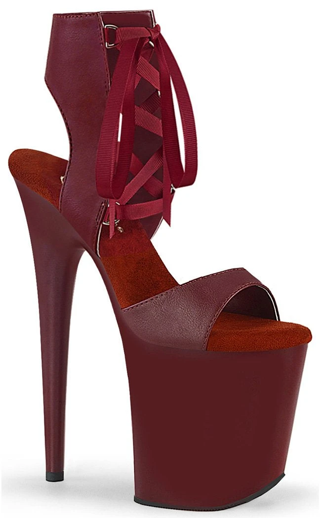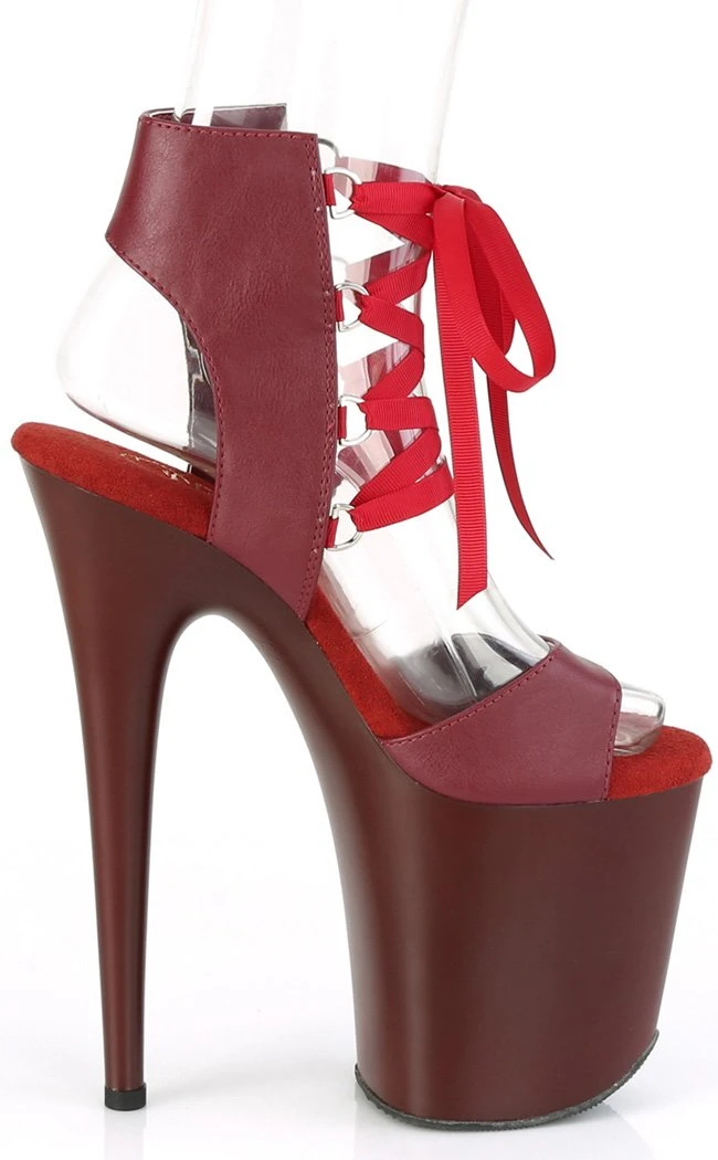 A bootie sandal with an 8″ Heel and a 4″ platform. A ribbon lace up front and peep toe are super cute, along with a cut out heel.
