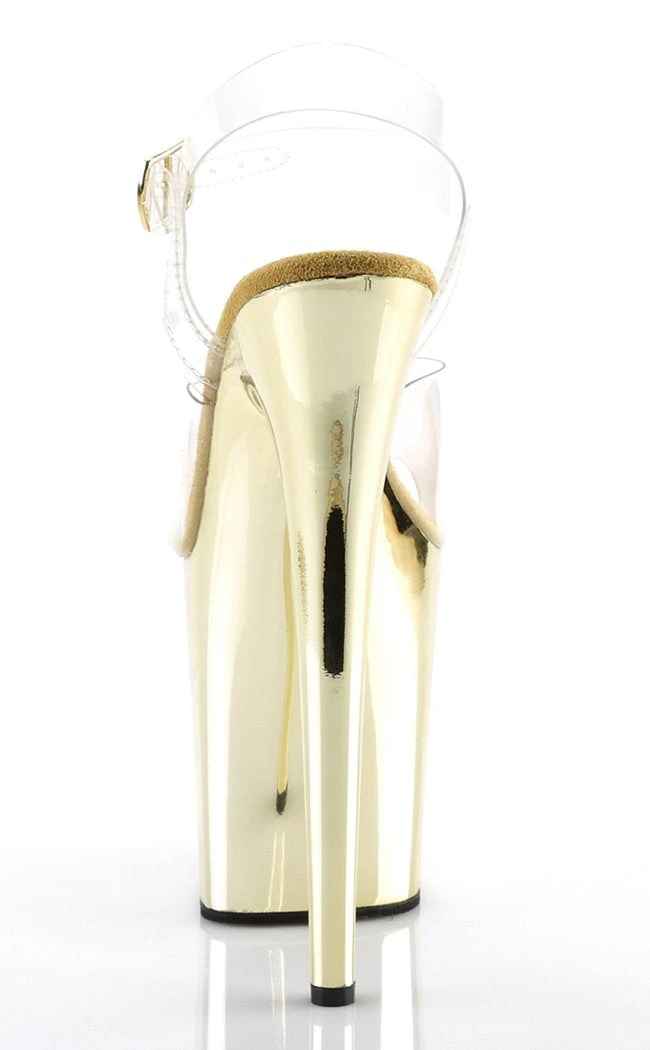 Stand tall, babe! You’ll be towering over the crowd in the Flamingo series. These pole-dancing shoes feature a crystal clear upper and gold chrome platform and stiletto heel.