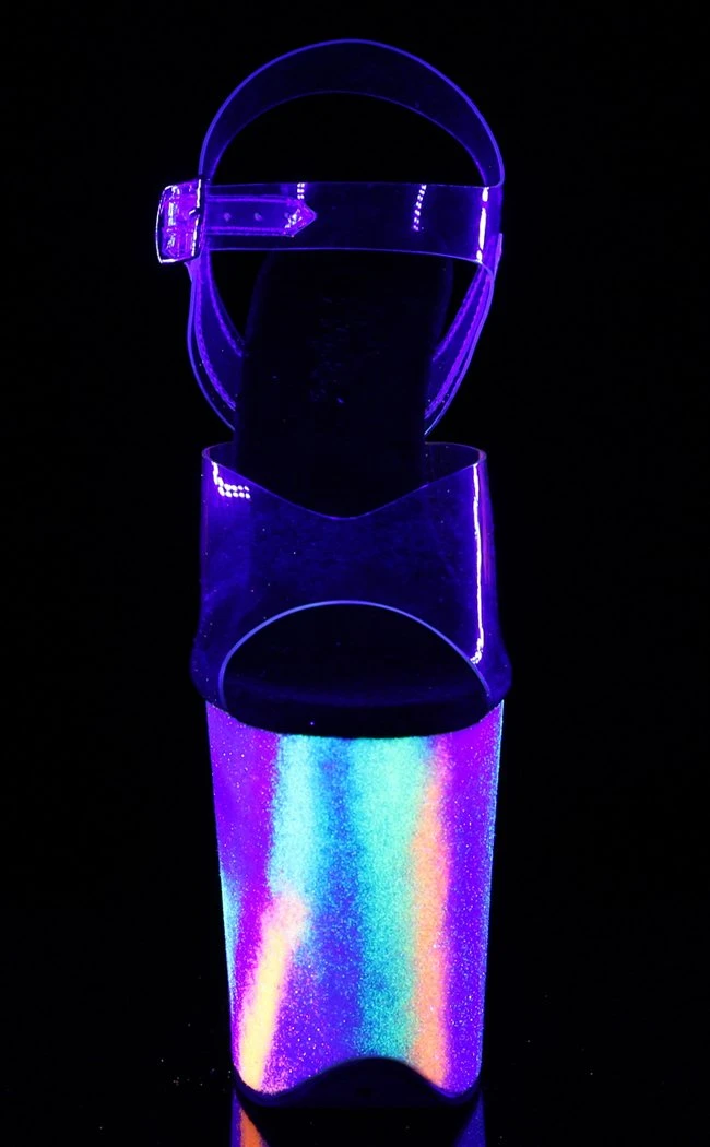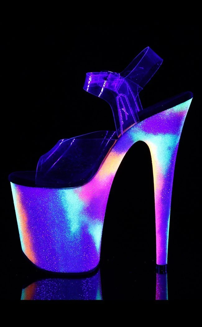 8″ (200mm) Heel, 4″ (100mm) Platform Ankle Strap Sandal Featuring Blacklight Reactive Neon Galaxy Effect on the Platform Bottom