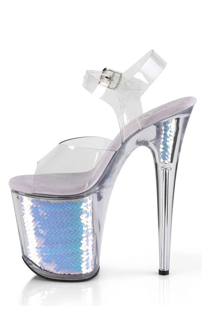 Be a dancing mermaid babe in these! 8″ (200mm) Heel, 4″ (100mm) Platform Ankle Strap Sandal Featuring Holographic Mermaid Scales Inserts in the Platform Bottom & Heel