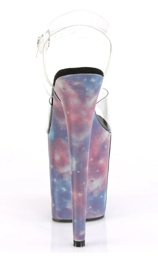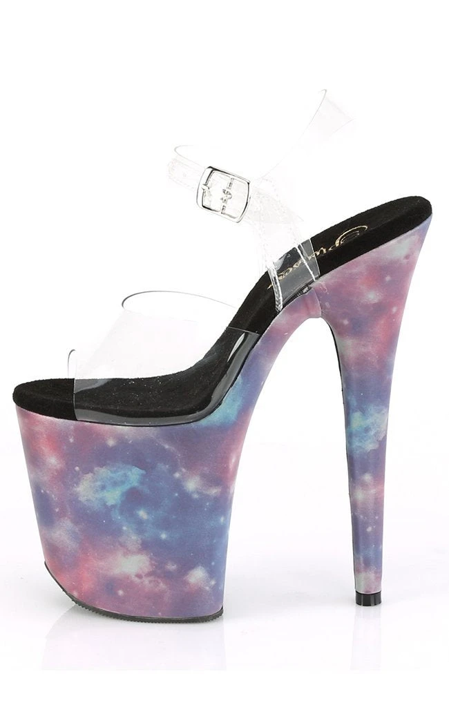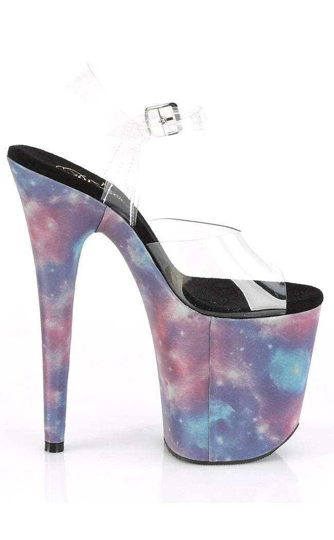 8″ (200mm) Heel, 4″ (100mm) Platform Ankle Strap Sandal Featuring Reflective Galaxy Effect Wrapped Platform Bottom