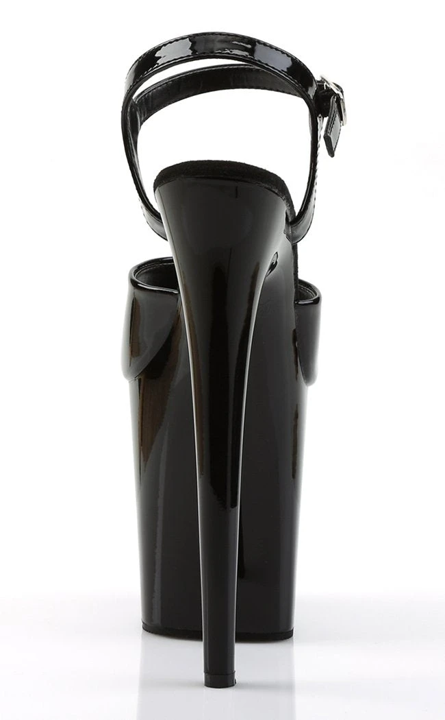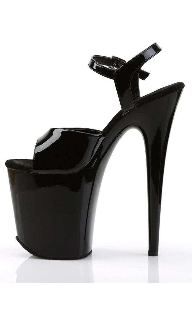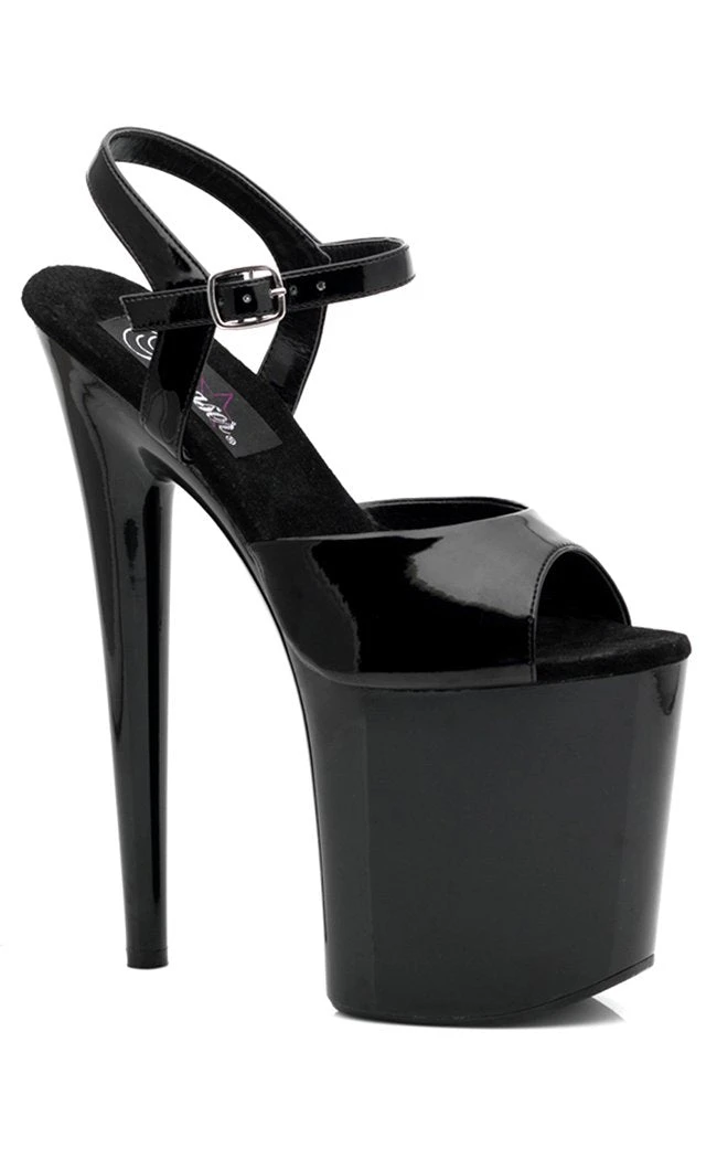 Ultra shiny black patent pole-dancing shoes with a sky-high 8-inch stiletto heel and 4-inch platform.