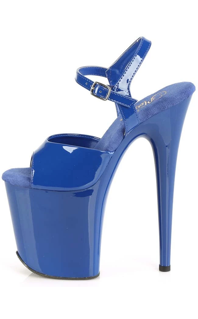 Step into the cool blue FLAMINGO-809 heels! These towering platforms feature a shining royal blue patent upper and a matching platform, securing with a buckled ankle strap.