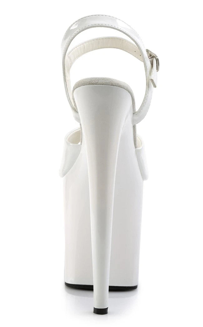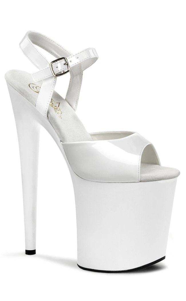 White patent pole-dancing shoes with a sky-high 8-inch stiletto heel and 4-inch platform.