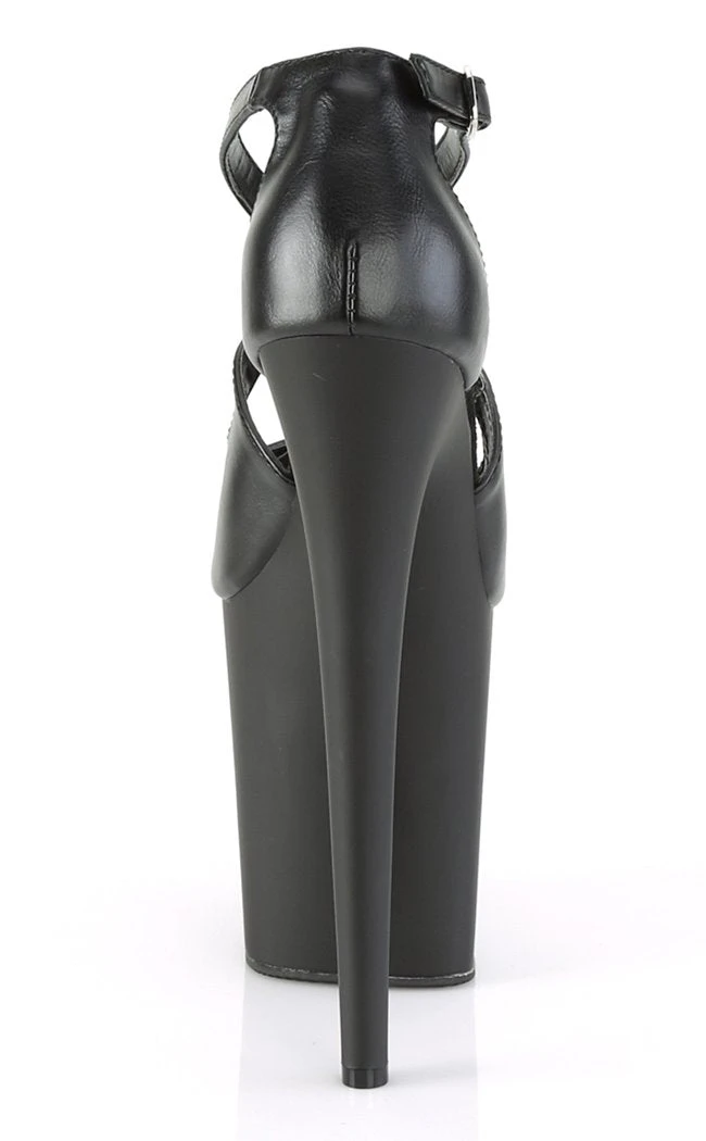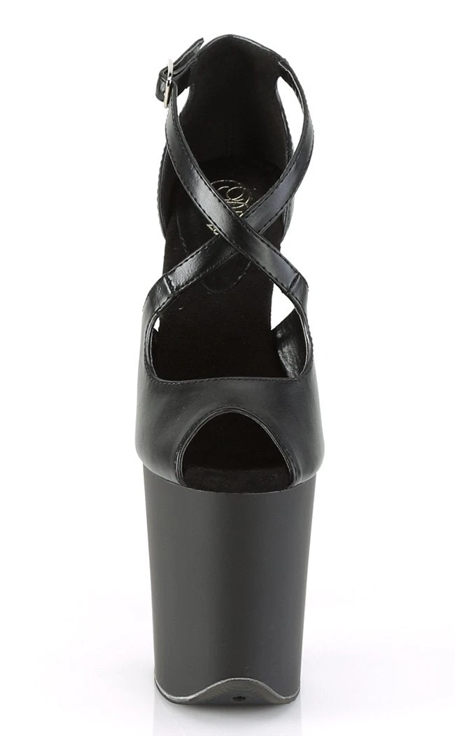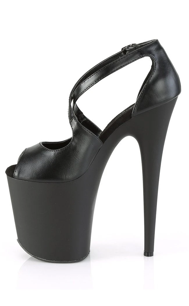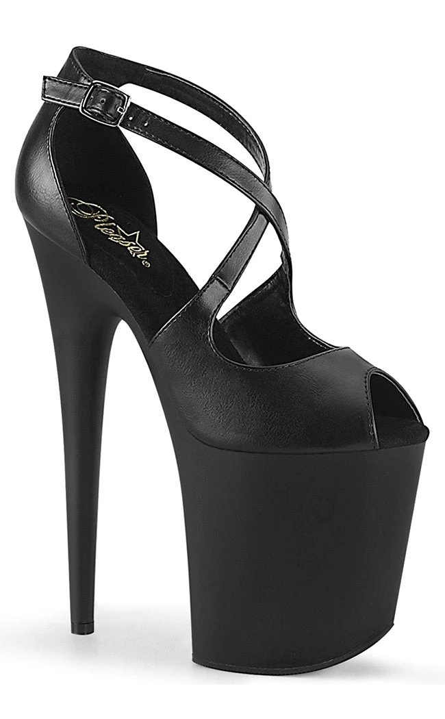 Black vegan pole-dancing shoes with crossover straps, faux leather upper and matte black platform.