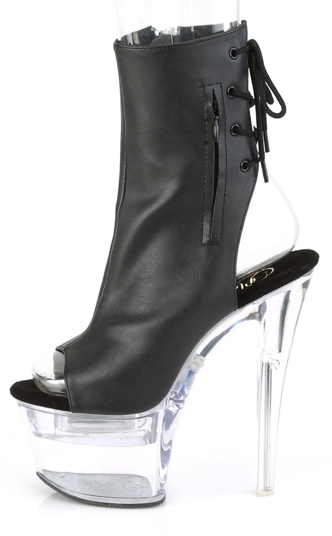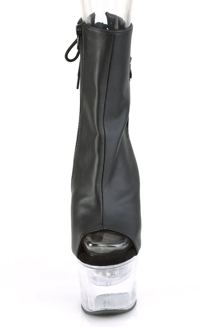 7″ (178mm) heel, 2 3/4″ (70mm) platform USB chargeable LED light-up open toe/ heel lace-up back ankle boot w/ multiple static/ changing color options & light settings