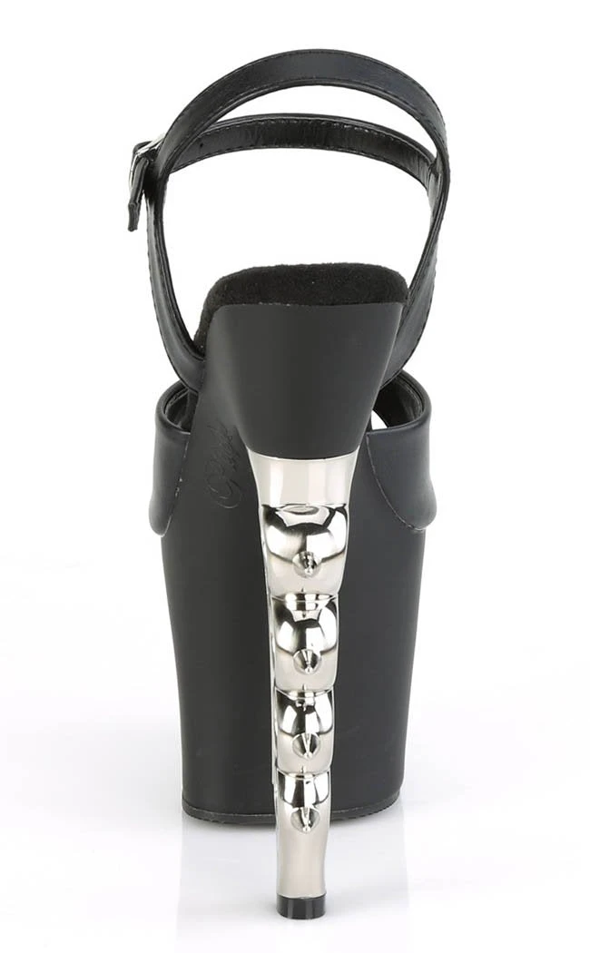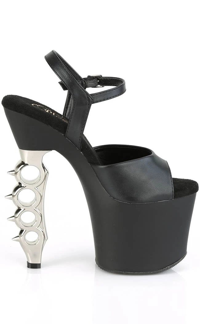 Strap a pair of deadly weapons to those feet! These heels have a black matter upper and platform, the heel shaped after a pair of silver spiked brass knuckles.Â