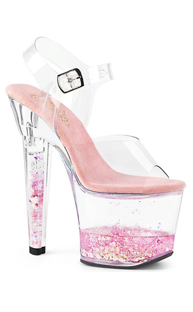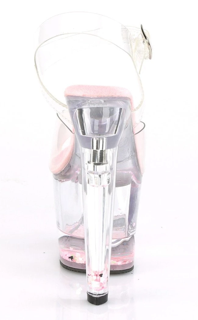Gorgeous crystal clear pole dance shoes with liquid and pink heart glitter-filled platform and heel.