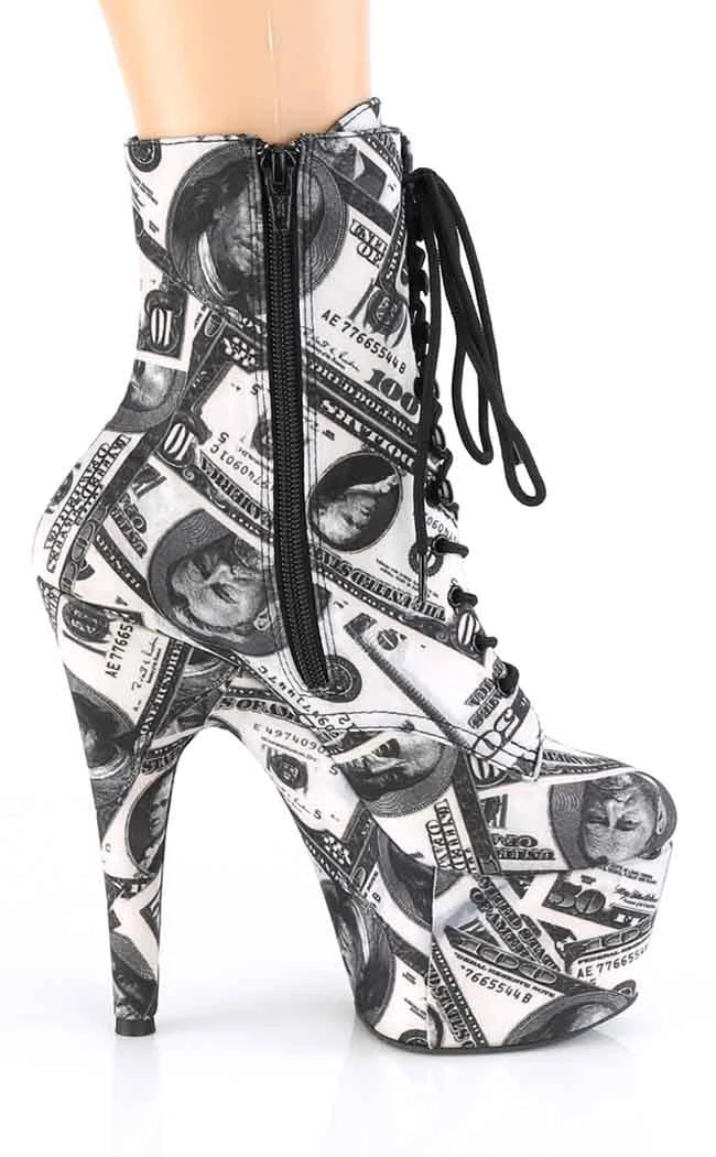 7″ (178mm) heel, 2 3/4″ (70mm) platform US money black and white print lace-up ankle boot, inside zip closure