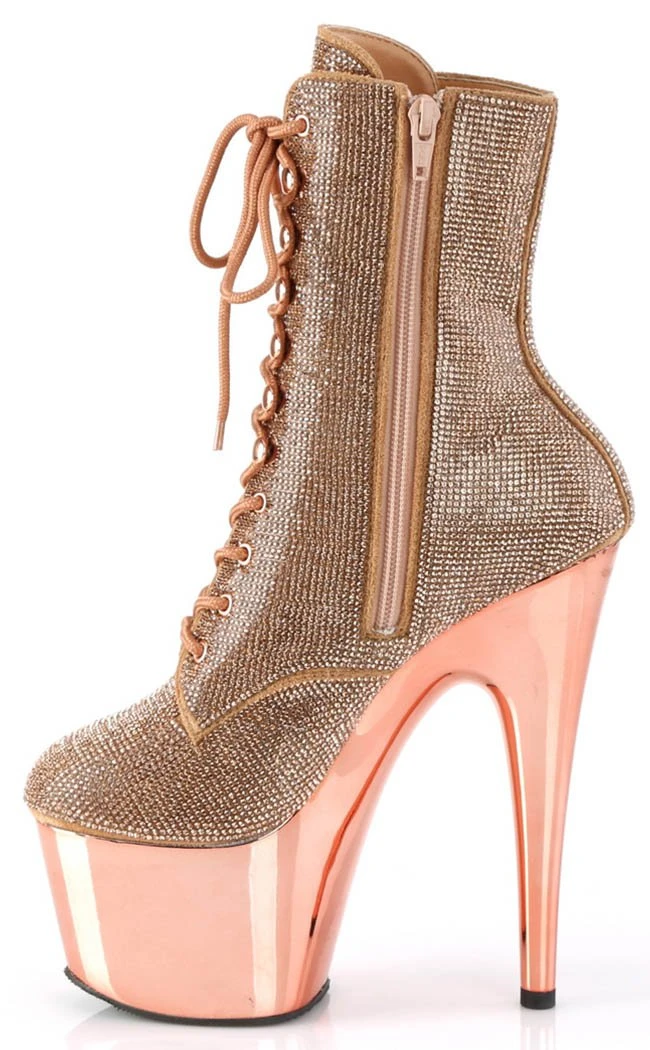 These babies are totally extra! The upper is totally embellished with rose gold rhinestones that glitter and shine with the matching rose gold mirror chrome platform and heel. These boots secure with a lace up front and side zip.