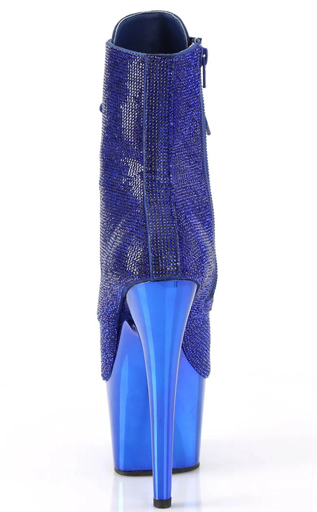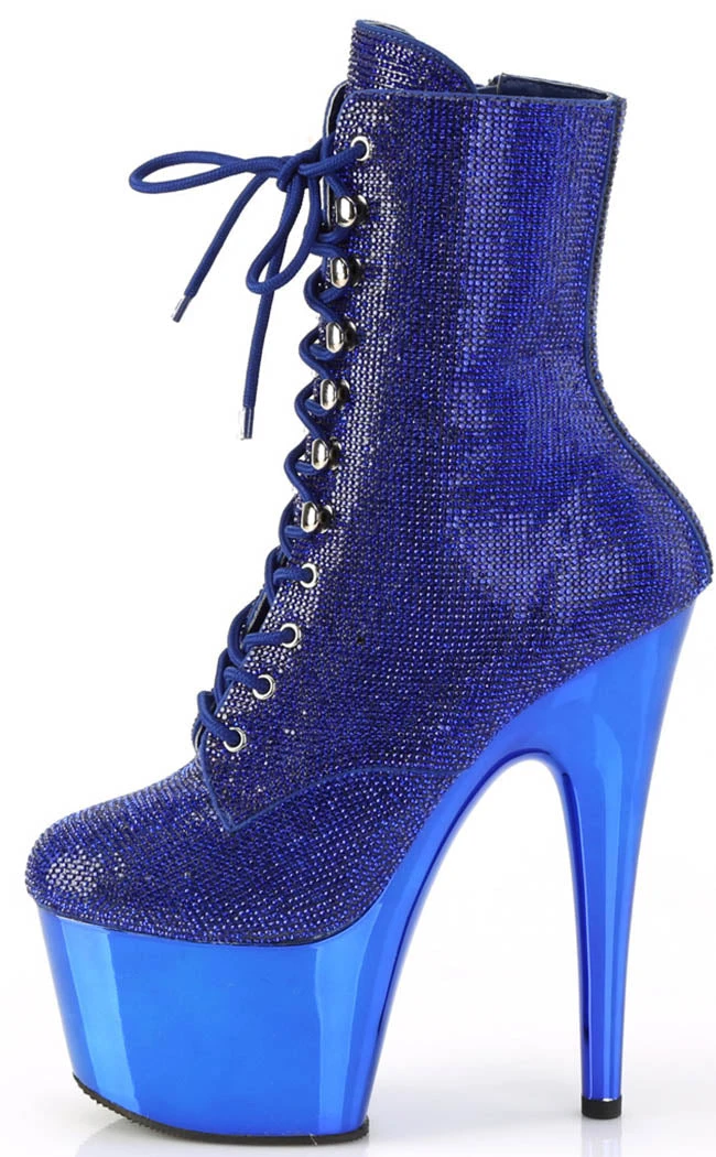 These babies are totally extra! The upper is totally embellished with royal blue rhinestones that glitter above a matching royal blue platform and heel. These boots secure with a lace-up front and side zip.