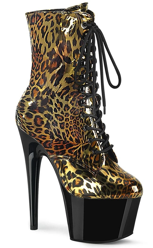7″ (178mm) heel, 2 3/4″ (70mm) platform lace-up ankle boot, inside zip closure