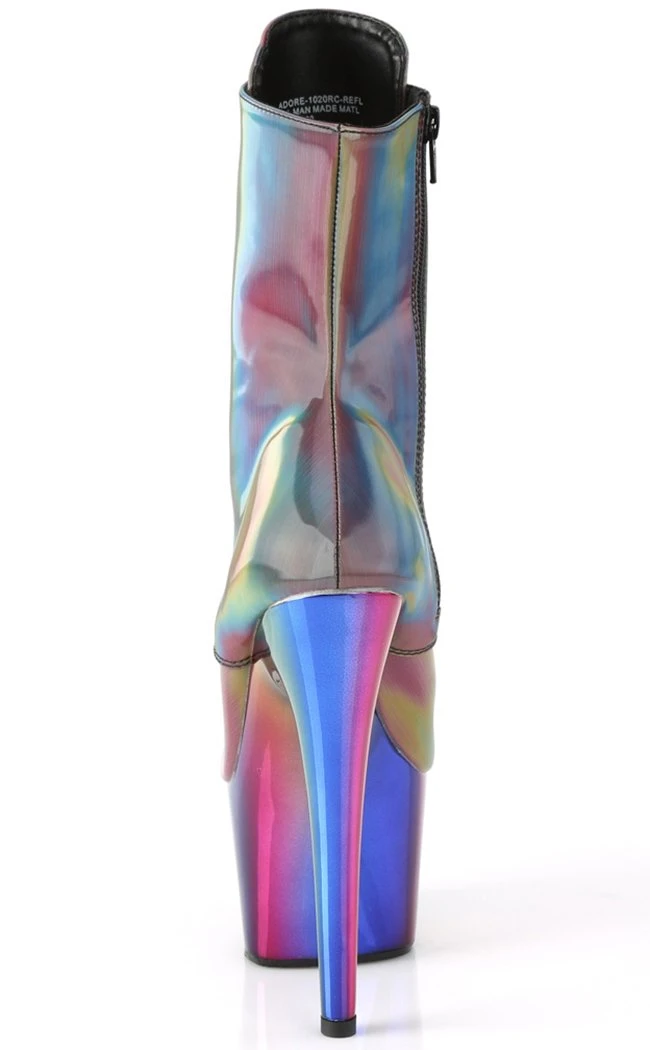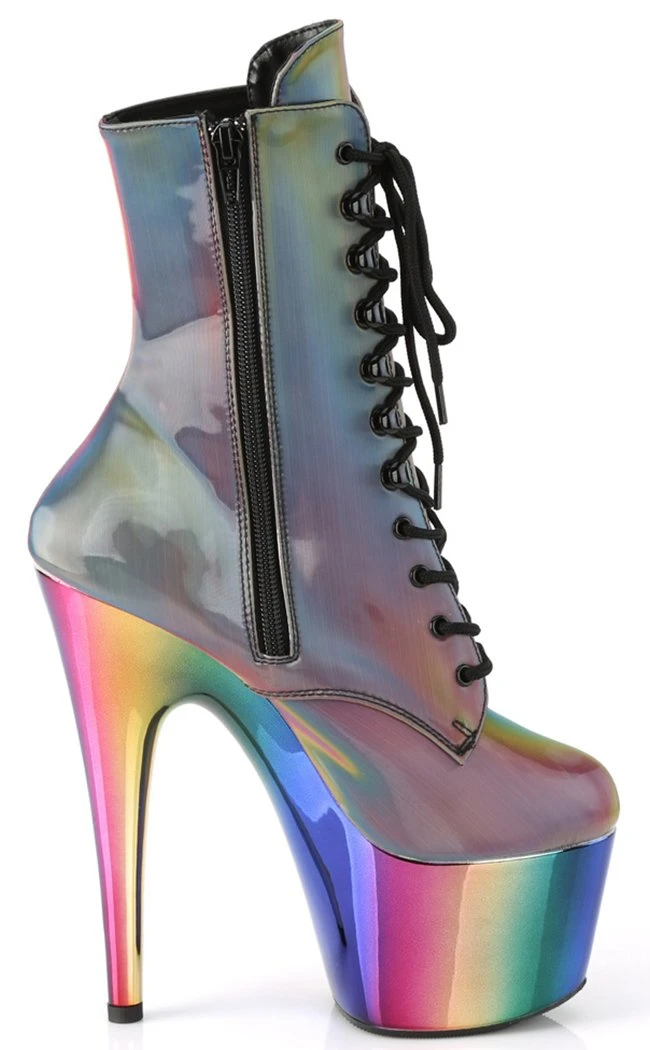 This bootie has a reflective rainbow upper that glows under blacklight and a shining rainbow chrome heel and platform. With a lace up front and inner zip for easy on/off, these booties are ideal for cyber dancers and futuristic pole fitness fanatics.