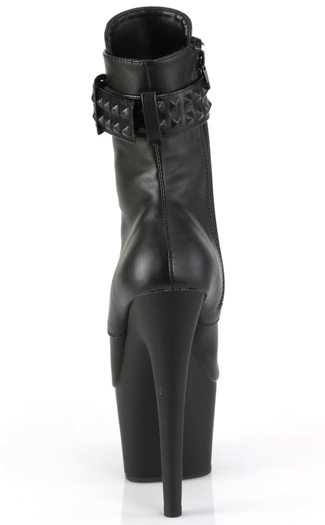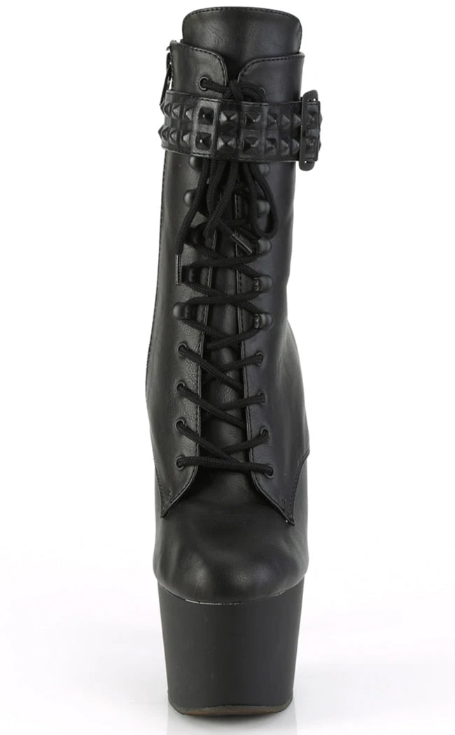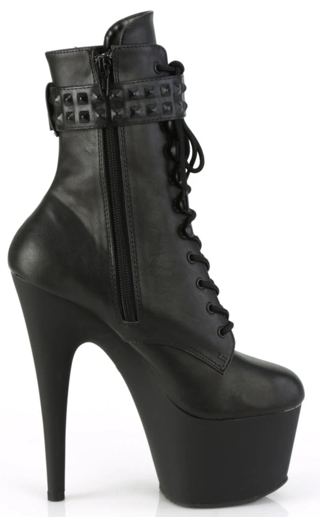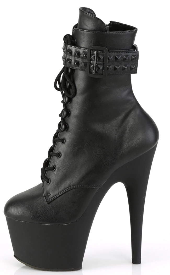 Go punk with the ADORE-1020STR boots! These heels are made with luxe faux leather and feature a studded ankle strap. They secure with a lace-up and inner zip.