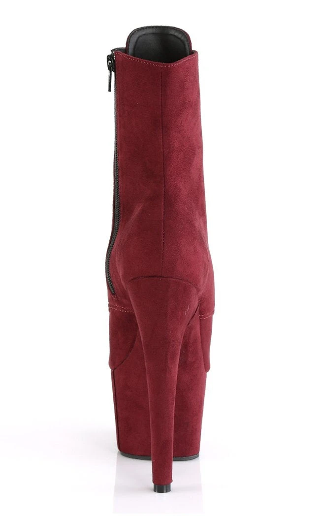 7″ (178mm) heel, 2 3/4″ (70mm) platform open toe lace-up front ankle boot featuring fully wrapped platform bottom, inside zip closure