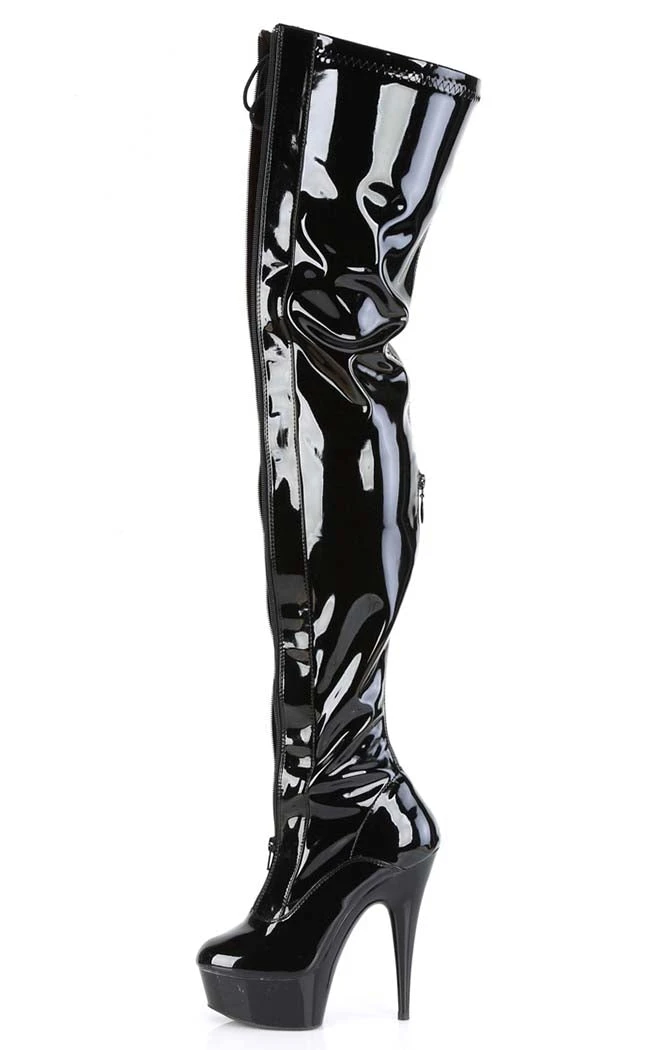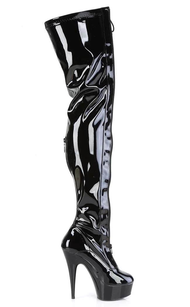 Light up the stage in the DELIGHT-3027 boots! These sexy thigh highs feature a two-toned patent upper and a front lace-up panel. A front and rear zip allow for easy on/off.