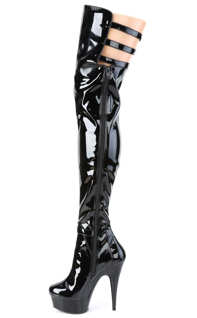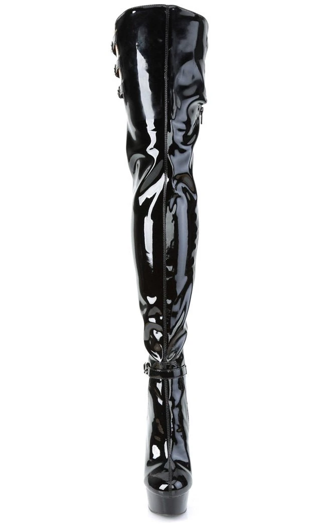 6″ (152mm) Heel, 1 3/4″ (45mm) Platform Thigh High Boot Featuring Ankle Strap and Triple Buckle Straps at the Top, Inside Zip Closure