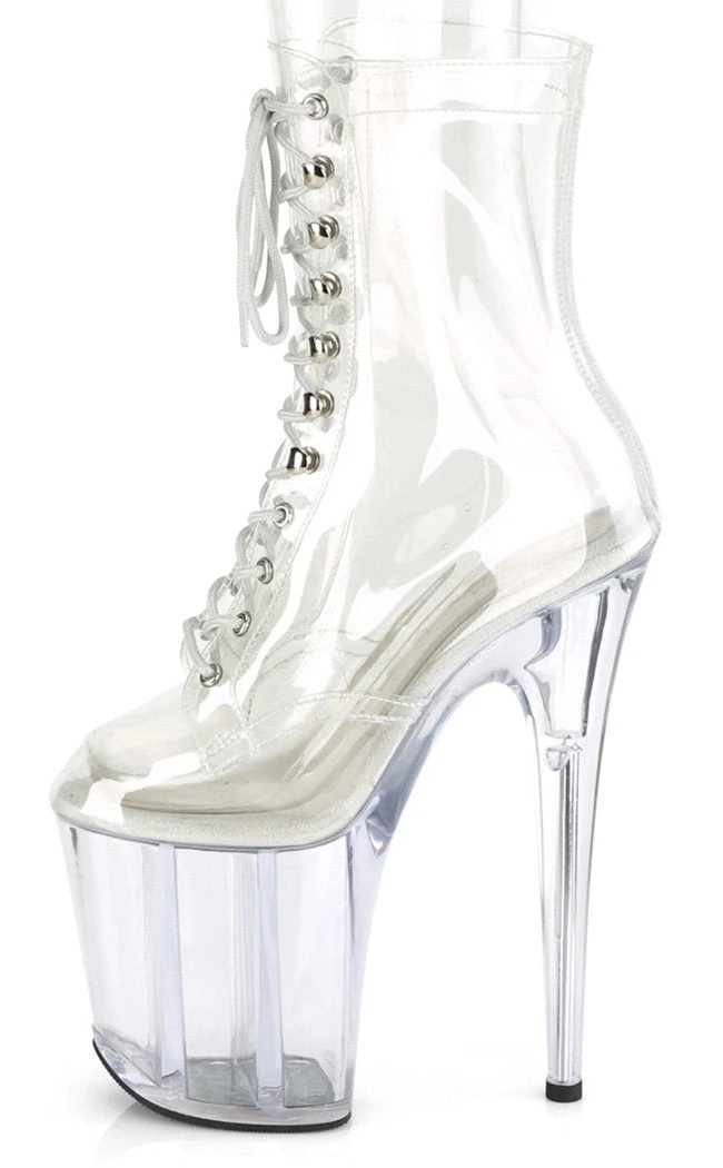 Clear ankle length boots with an 8″ heel and 4″ platform. Secures with a lace-up front.