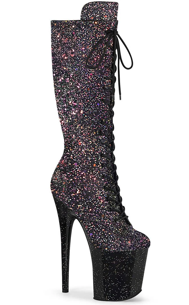 These gorgeous Flamingo boots are knee length and have an upper completely covered in black multi glitter. They fasten with a lace up front and side zip.