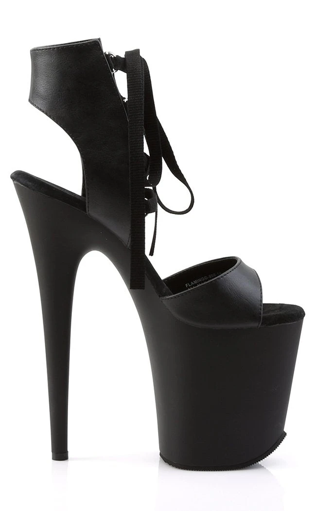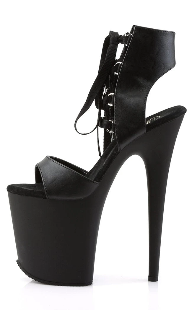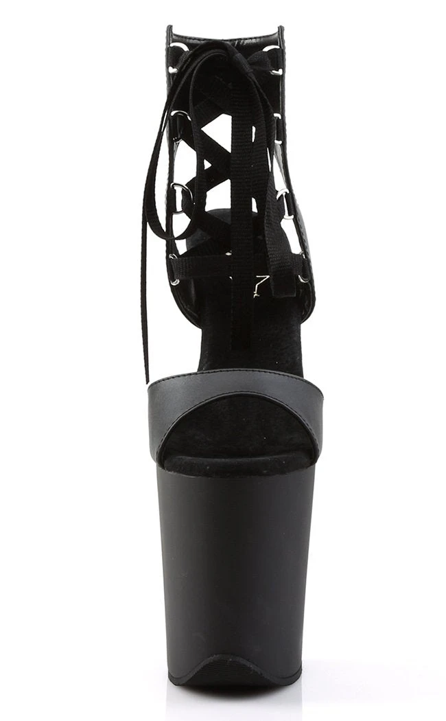 A bootie sandal with an 8″ Heel and a 4″ platform. A ribbon lace up front and peep toe are super cute, along with a cut out heel.