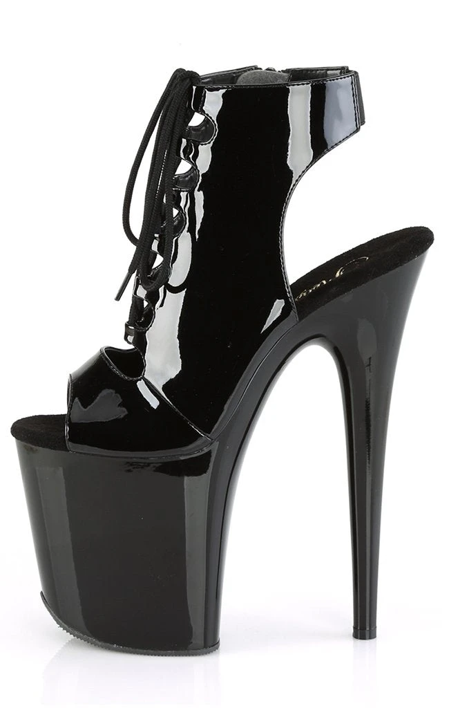 8″ (200mm) heel, 4″ (100mm) platform open toe/heel sandal w/ lace-up ties & wrapping straps closure, full inside zip closure