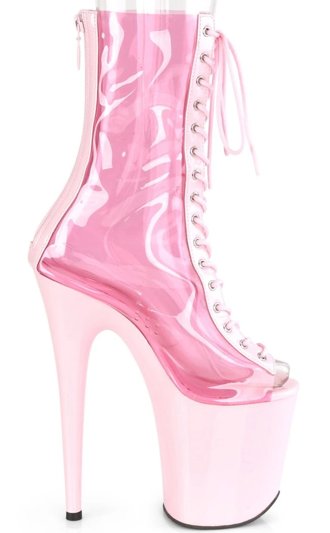 Candy sweet platform boots! A clear pink upper sits on baby pink patent for all you pastel fiends and unicorn rainbow queens!