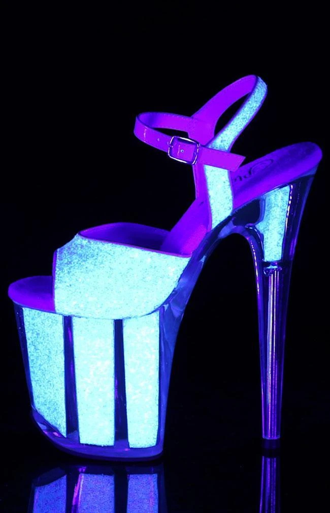 8″ Heel, 4″ platform glitter ankle strap sandal with neon UV reactive opal glitter.