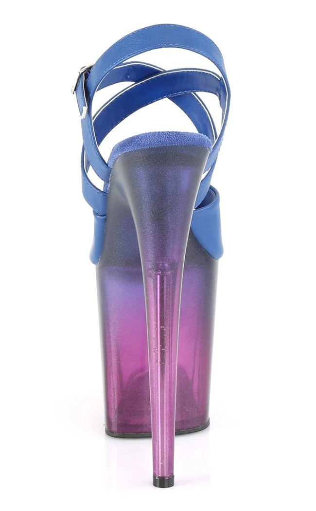 Beautifully coloured pole-dancing shoes with crossover straps, blue faux leather upper and sheer blue to violet ombre platform.