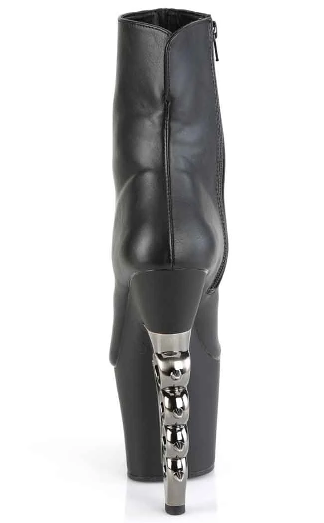 These boots are a real knockout! Ankle height, these matte booties have a 7″ (178mm) heel shaped after a silver pair of spiked brass knuckles, complemented by a 2 3/4″ (70mm) platform. These boots secure with an inner zip for easy on/off.