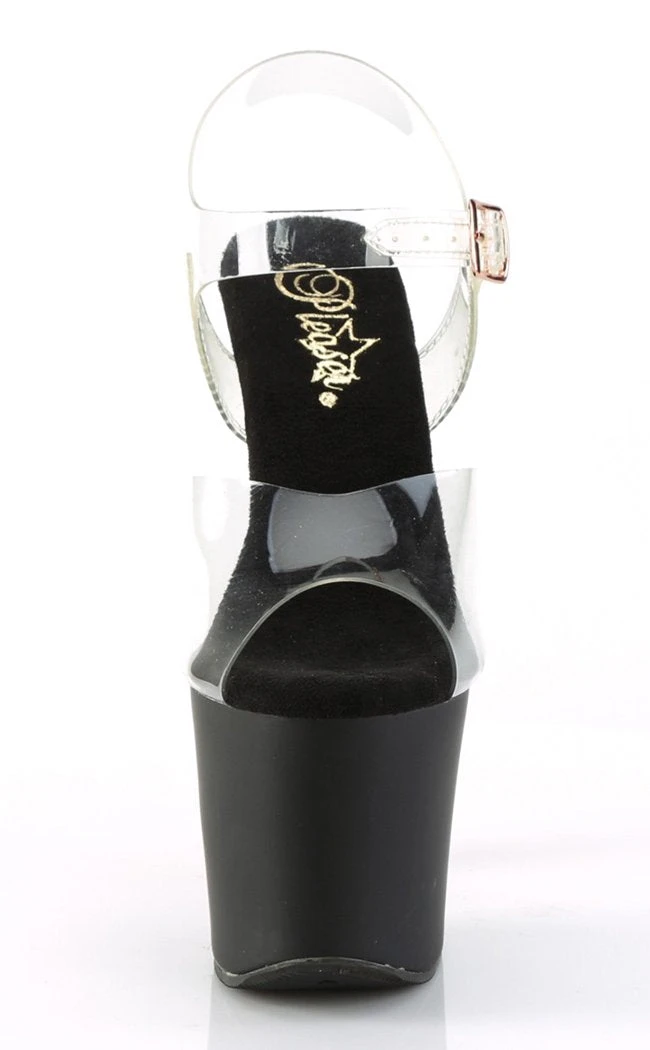 Strap a pair of deadly weapons to those feet! These heels have a clear upper and a black platform, the heel shaped after a pair of copper, spiked brass knuckles.Â