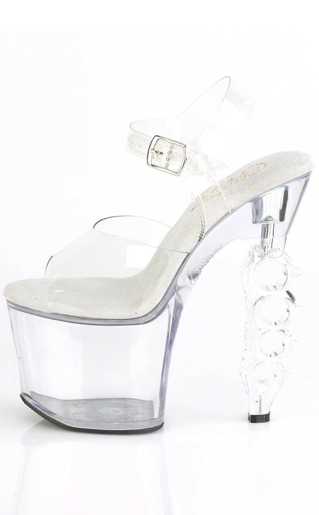 Strap a pair of deadly weapons to those feet! These heels have a clear upper and platform, the heel shaped after a pair of spiked brass knuckles.