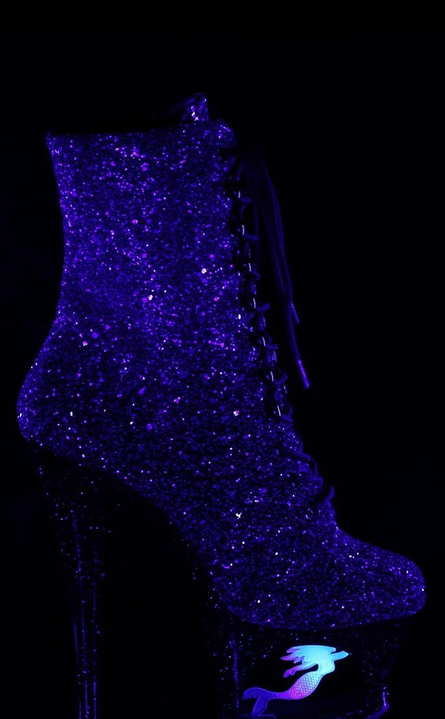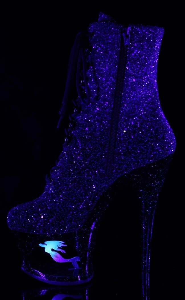 7″ (178mm) heel, 2 3/4″ (70mm) cut-out platform lace-up front ankle boot featuring blacklight reactive swimming mermaid inside the platform cutout and mini iridescent glitters on the entire platform bottom, full inside zip closure.