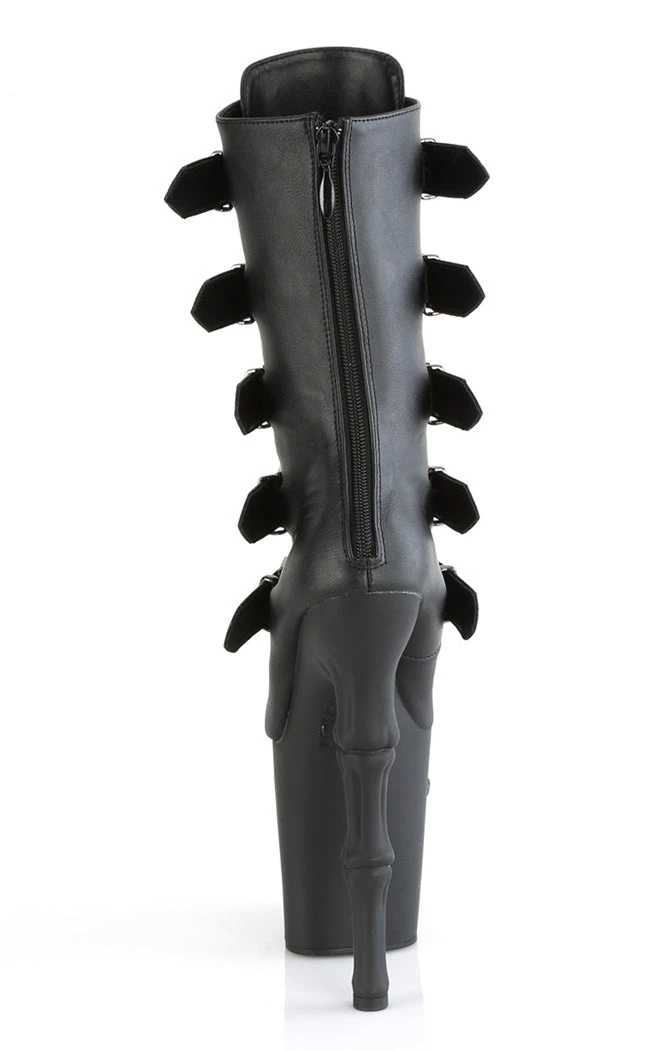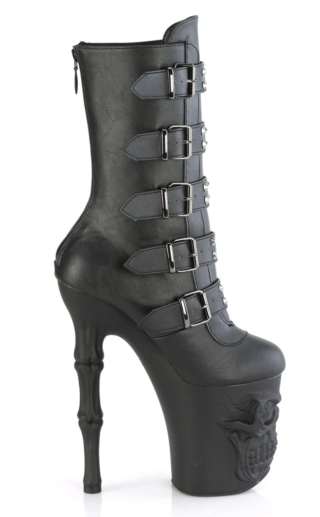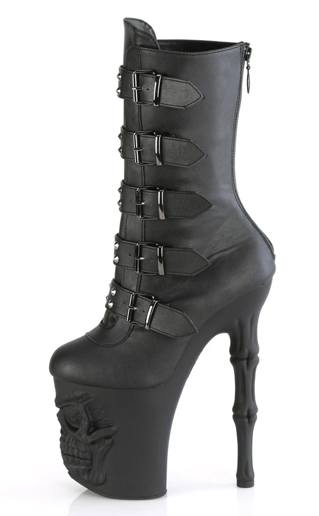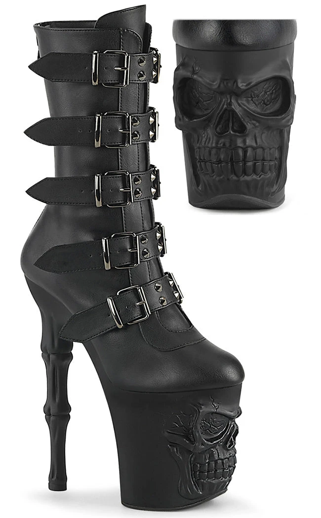 Become yer own reaper in the RAPTURE-1052BK boots! These boots feature a black matte upper that secures with 5 studded buckles and a rear zip. The platforms are the real showstopper, featuring a grinning skull and fingerbone heel in a matte black finish.