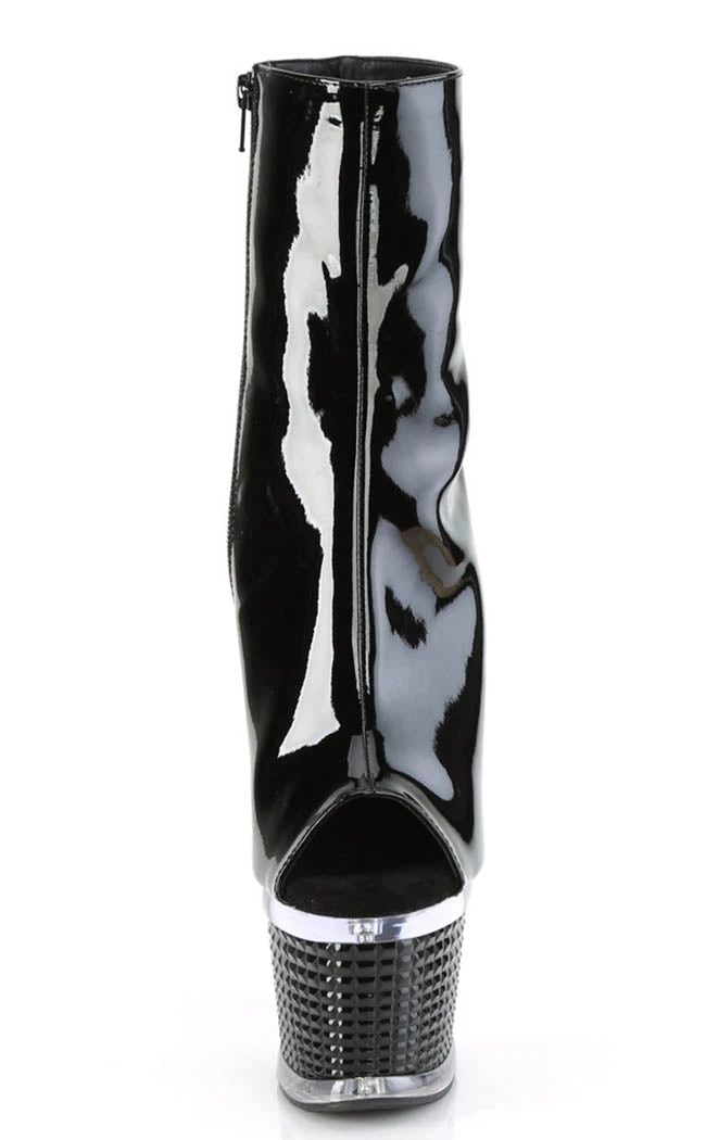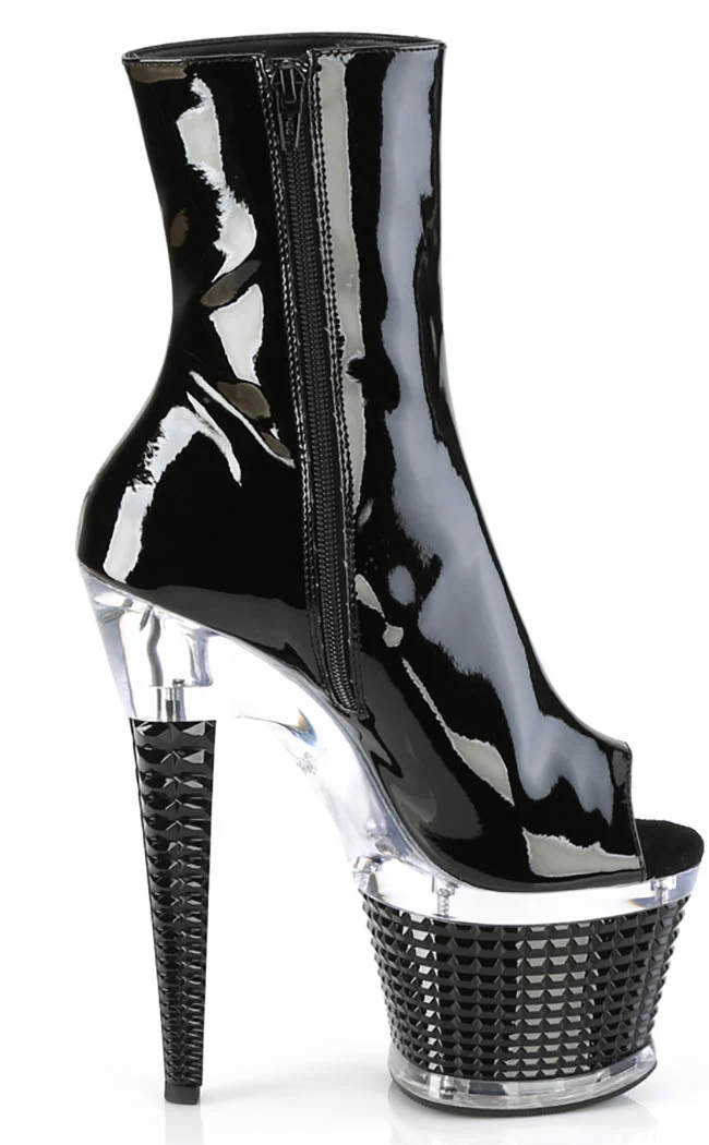 You’re a one-woman show, baby! The SPECTATOR-1012 ankle booties feature a black patent upper, a peep toe and an inner zip closure. The platform features a clear band and a black stud wrap.