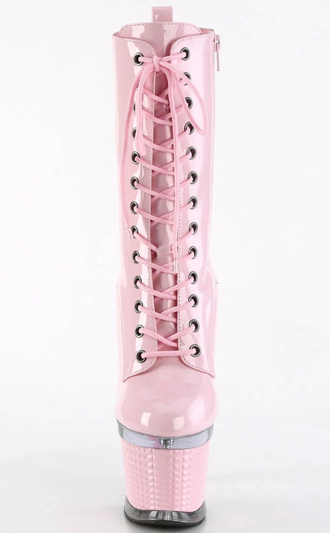 You’re a one-woman show, baby! The SPECTATOR-1040 ankle boots feature a vegan baby pink patent upper that secures with a lace-up and side zip. The heel and platform are topped by a clear panel above a 3D stud look wrapping.