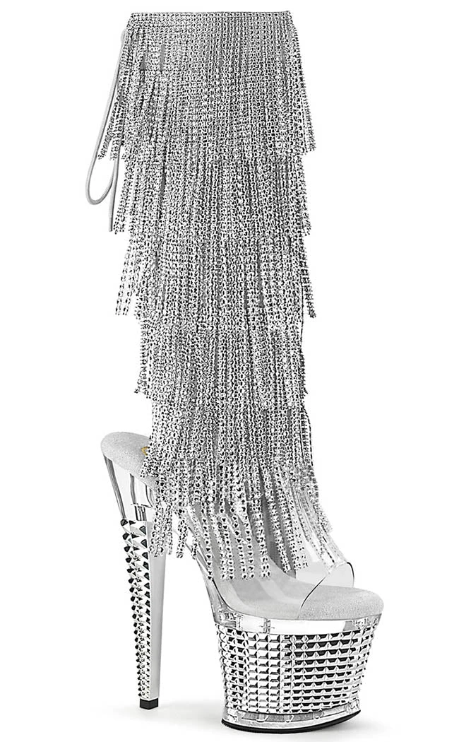 You’re a one-person show, baby! The SPECTATOR-2017 knee-high boots feature a clear upper with 6 layers of chrome rhinestone fringes that secures with a rear lace-up and inner zip. The platform and heel feature a clear segment on top of a stud effect panel.