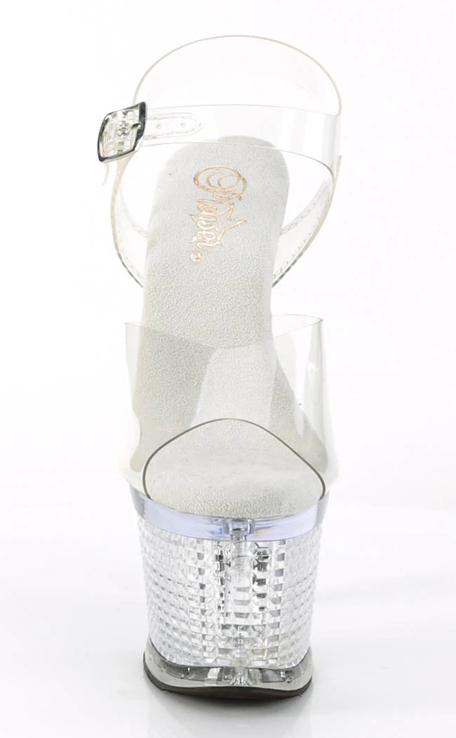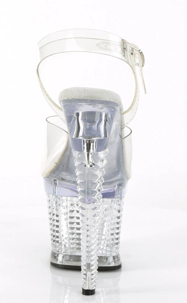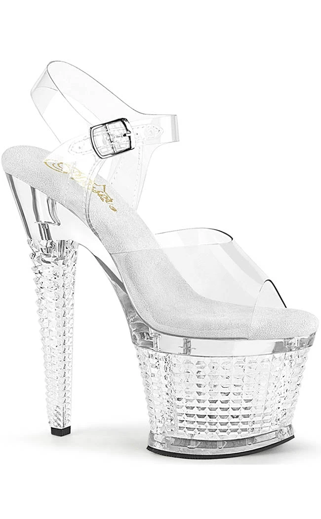 You’re a one-woman show, baby! The SPECTATOR-708 platforms are a sandal style heel with a peep toe and buckled ankle strap. The heel and platform are topped by a clear panel above a 3D stud look wrapping.