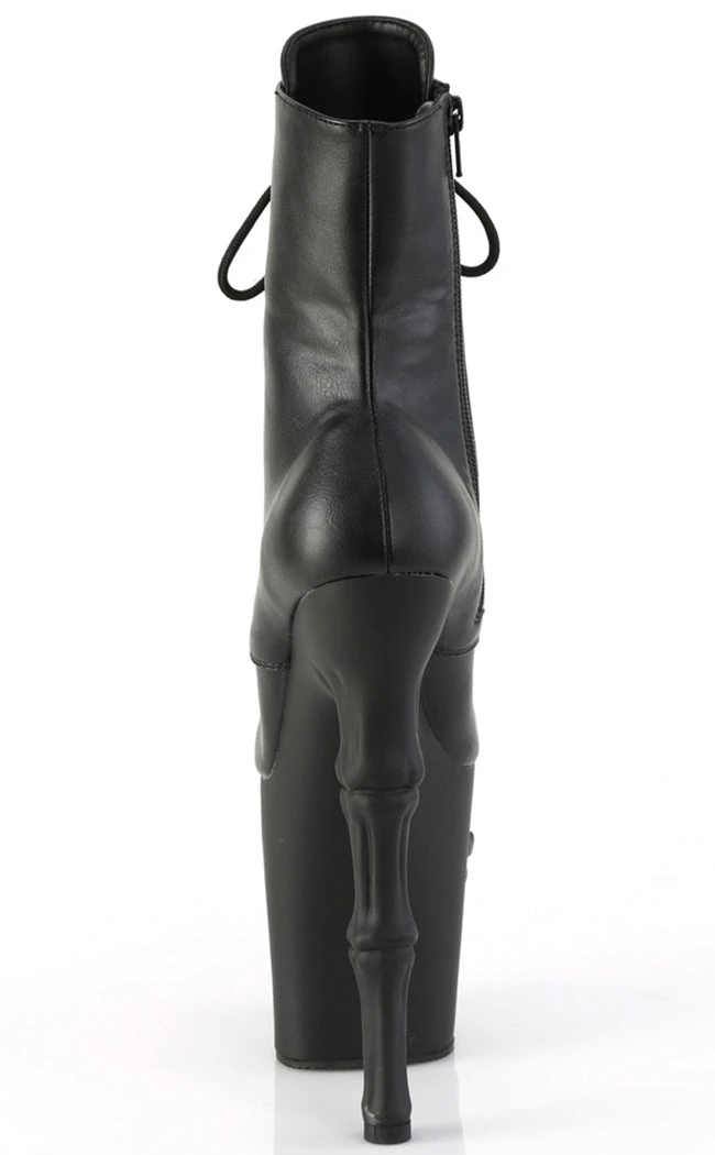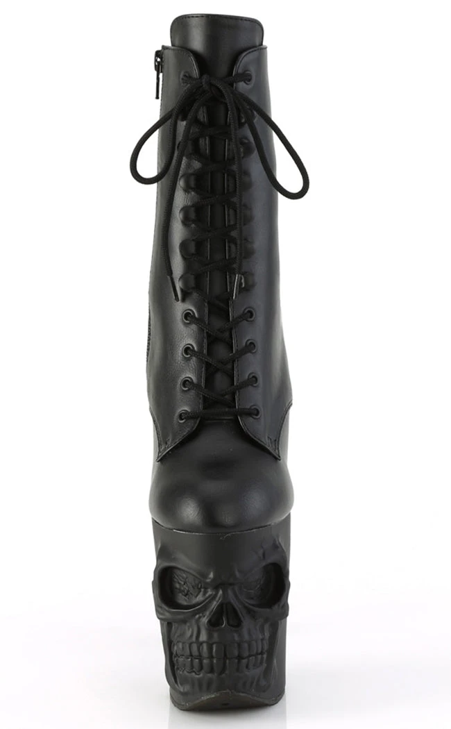 Become yer own reaper in the RAPTURE-1020 boots! These boots feature a black matte upper that secures with a lace-up panel and inner zip. The platforms are the real showstopper, featuring a grinning skull and fingerbone heel in a matte black finish.