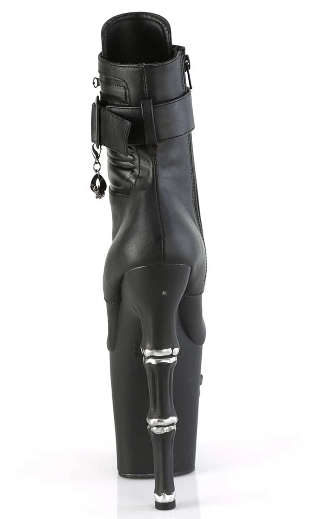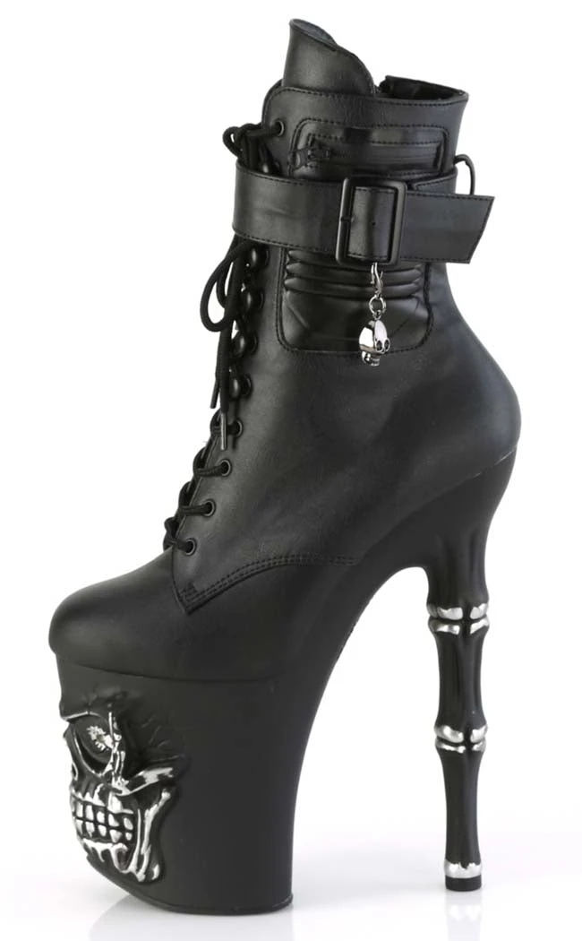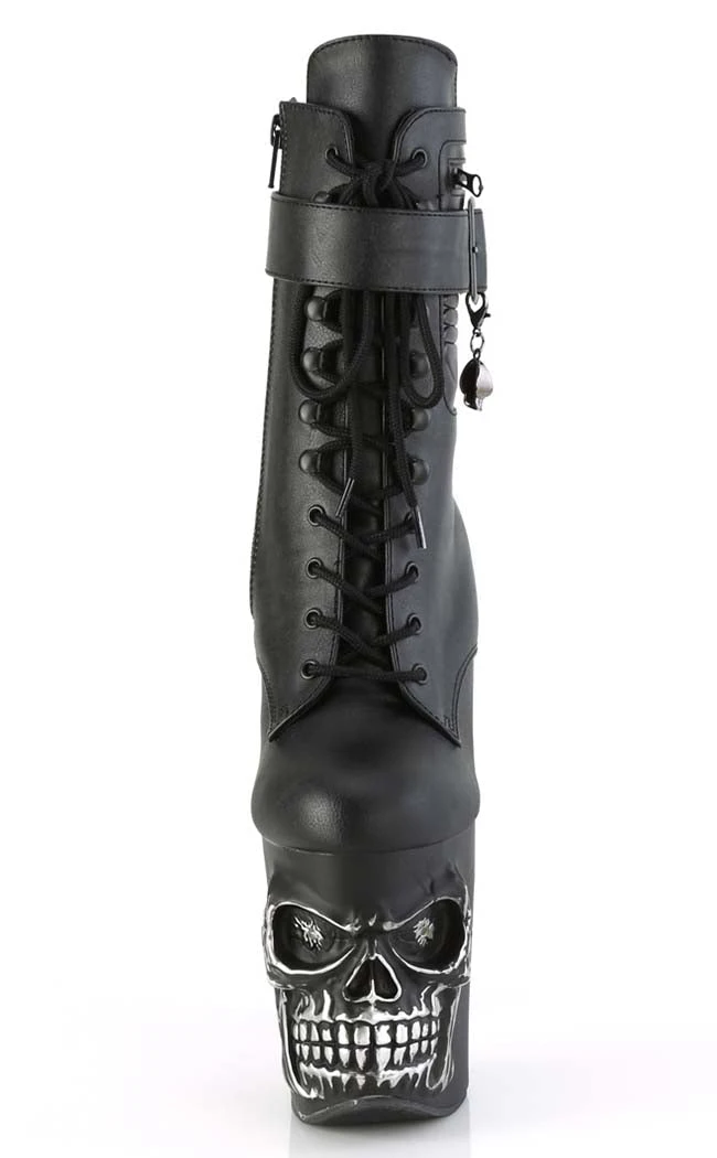 Make their lives flash before their eyes in the RAPTURE-1020STR-LT boots! These wicked platforms feature a black matte upper, a handy zipped pocket, lace-ups, an inner zip and a buckled ankle strap decked out with a cute skull charm.