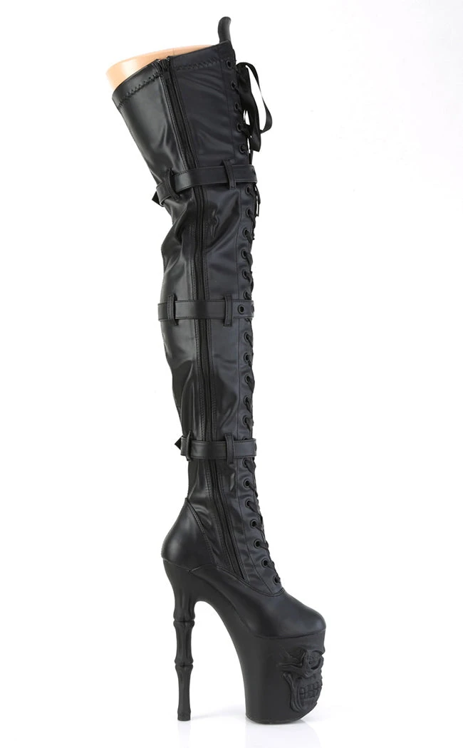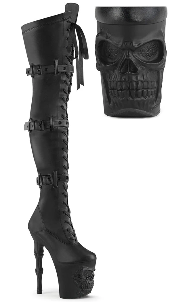Reap with yer feet in the RAPTURE-3028 boots! These sexy af thigh-high boots feature a black matte upper that secures with lace-ups, 3 buckled straps and a full-length inner zip. The platforms are the real showstopper, featuring a grinning skull and fingerbone heel in a matte black finish.