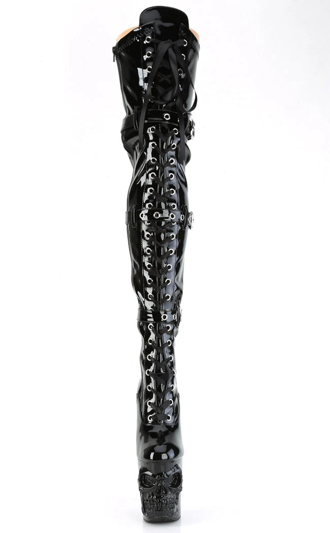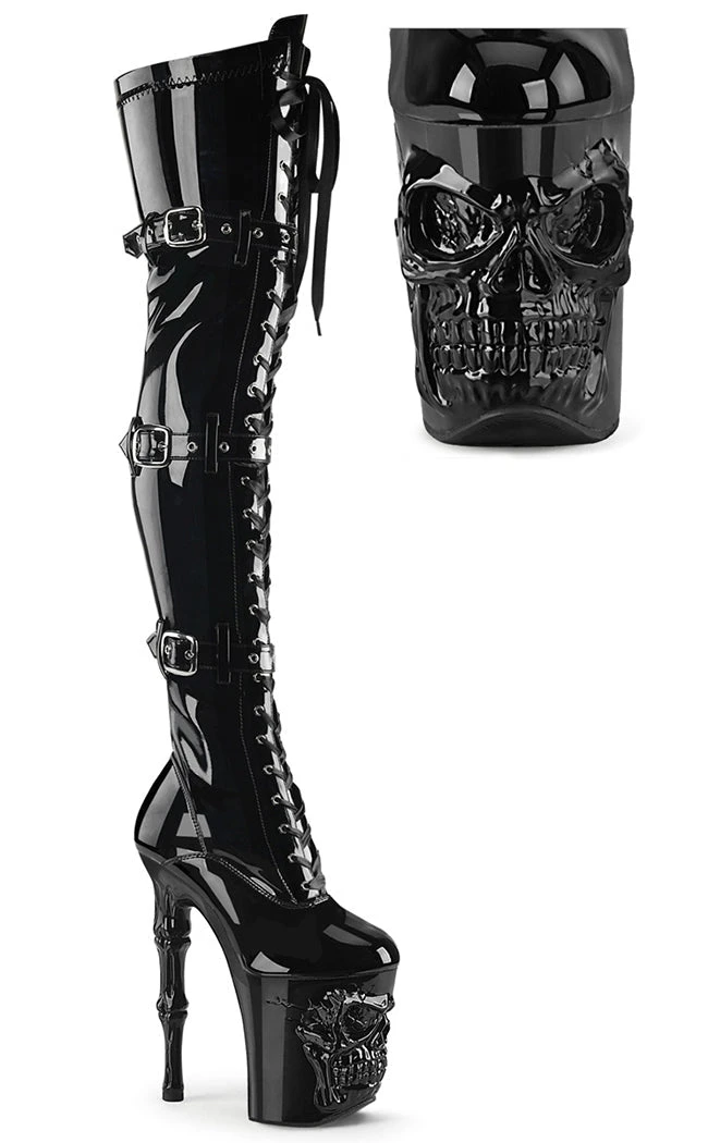 Become yer own reaper in the RAPTURE-3028 boots! These boots feature a black stretch upper that secures with a lace-up panel and inner zip. The platforms are the real showstopper, featuring a grinning skull and fingerbone heel in a glossy black finish.