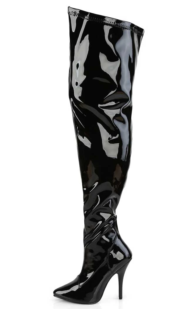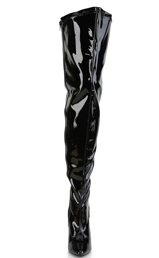 These thigh highs are a shiny, seductive black with a 5″ (127mm) stiletto heel and full-length inner zip closure.  The material is a stretch patent and the boots are designed to fit wide caves and fit a thigh circumference of 55cm.