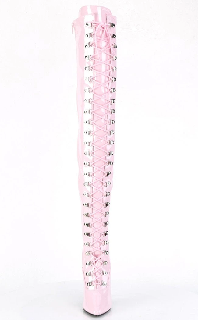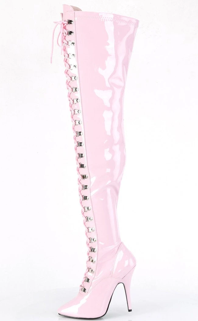 These thigh highs are a shiny, seductive baby pink with a 5″ (127mm) stiletto heel. The boots lace up and close with an inner zip.