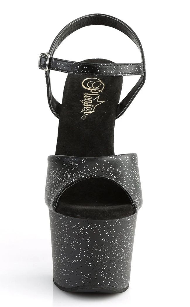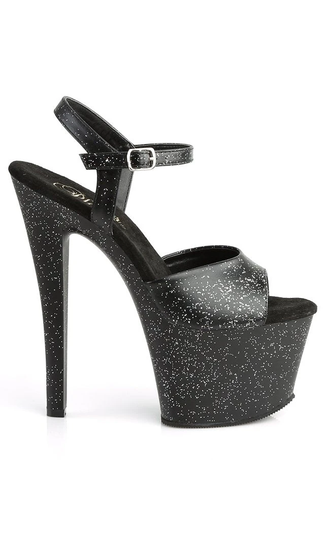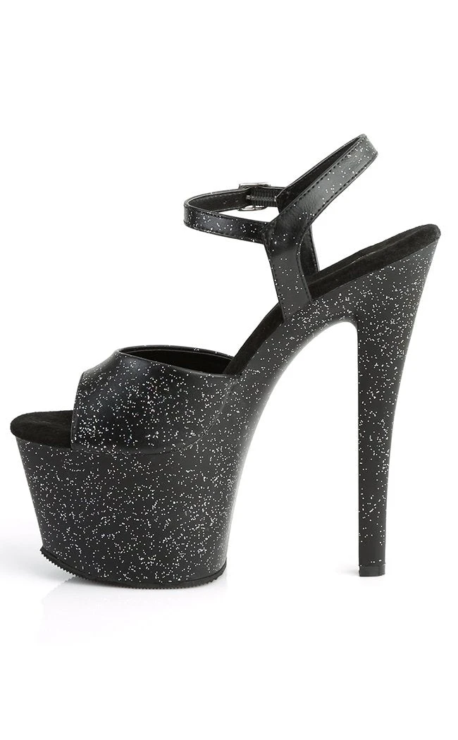 7″ (17.8cm) Heel, 2 3/4″ (7cm) Platform Ankle Strap Sandal Featuring Mini Iridescent Glitter on the Entire Upper & Platform